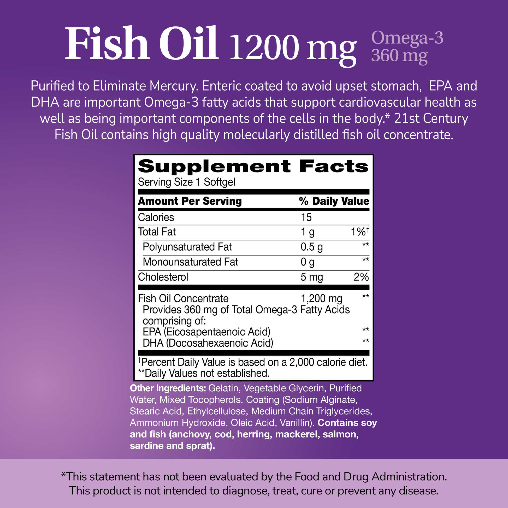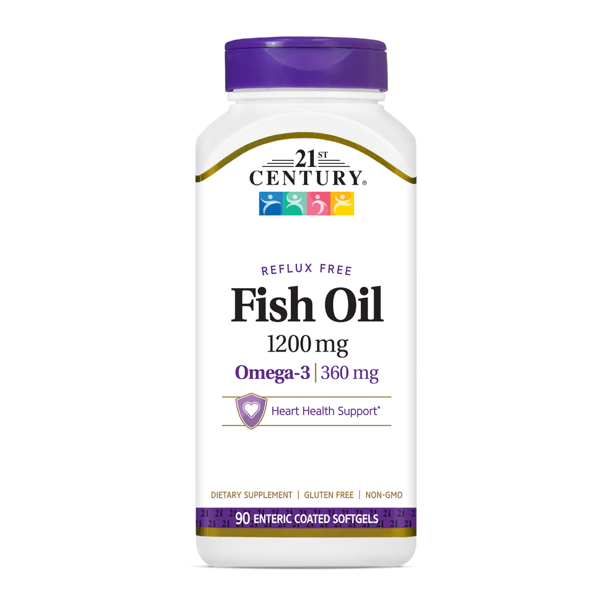 21ST Century Fish Oil provides a good source of EPA and DHA Omega-3 fatty acids with each serving. These Omega-3 fatty acids play a significant role in supporting cardiovascular health as well as being important components of the cells in the body and contributing to overall well-being.* This fish oil concentrate is enteric-coated to prevent reflux and fish burps and is molecularly distilled and purified to eliminate mercury, ensuring the highest quality and purity.