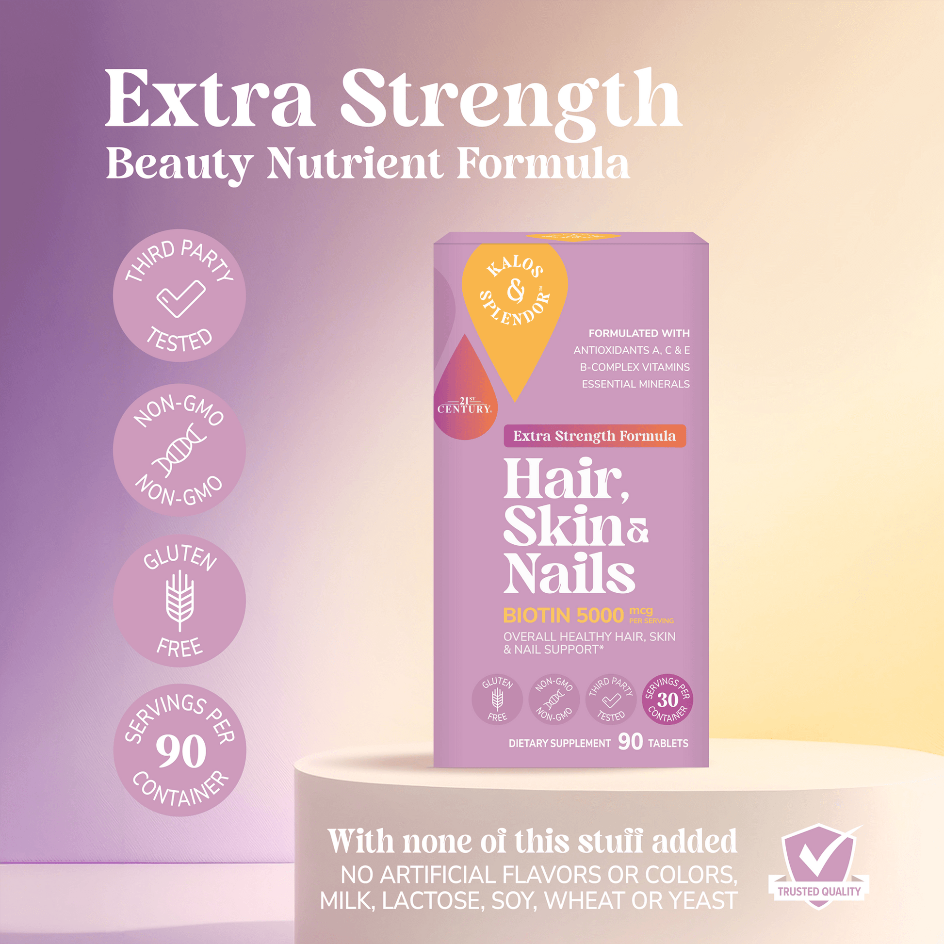 21st Century Kalos & Splendor Hair, Skin and Nails Extra Strength is a comprehensive beauty supplement and beauty vitamin. It is designed to nourish your hair, skin and nails from within.*