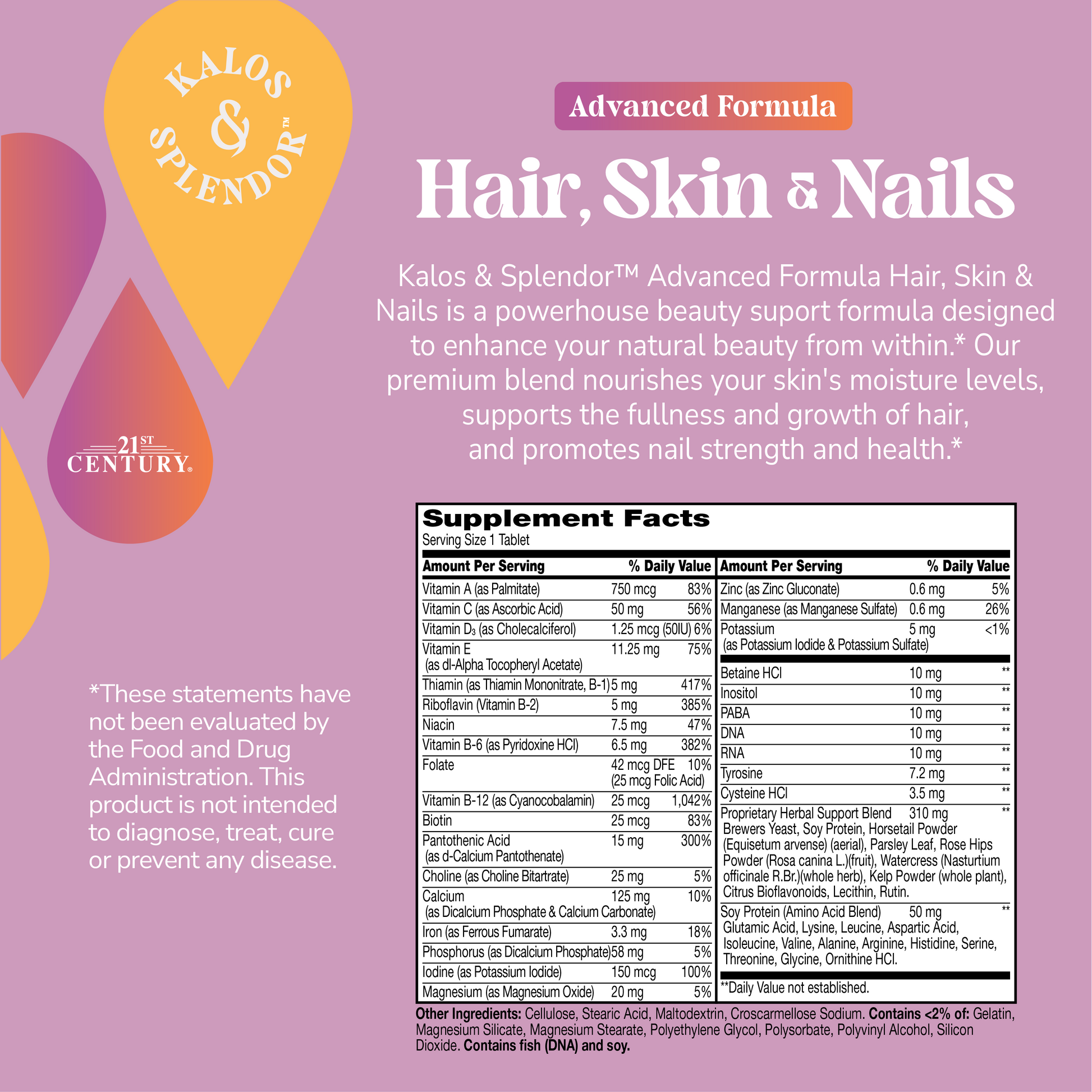 21ST Century Vitamins Advanced Formula Hair, Skin & Nails is a premium blend of natural herbs, vitamins, and minerals formulated to support the health of your hair, skin, and nails with just one tablet a day.* Packed with beauty supporting antioxidants, amino acids, a proprietary herbal blend and more, this formula adds optimum beauty support to your daily vitamins regimen.*
