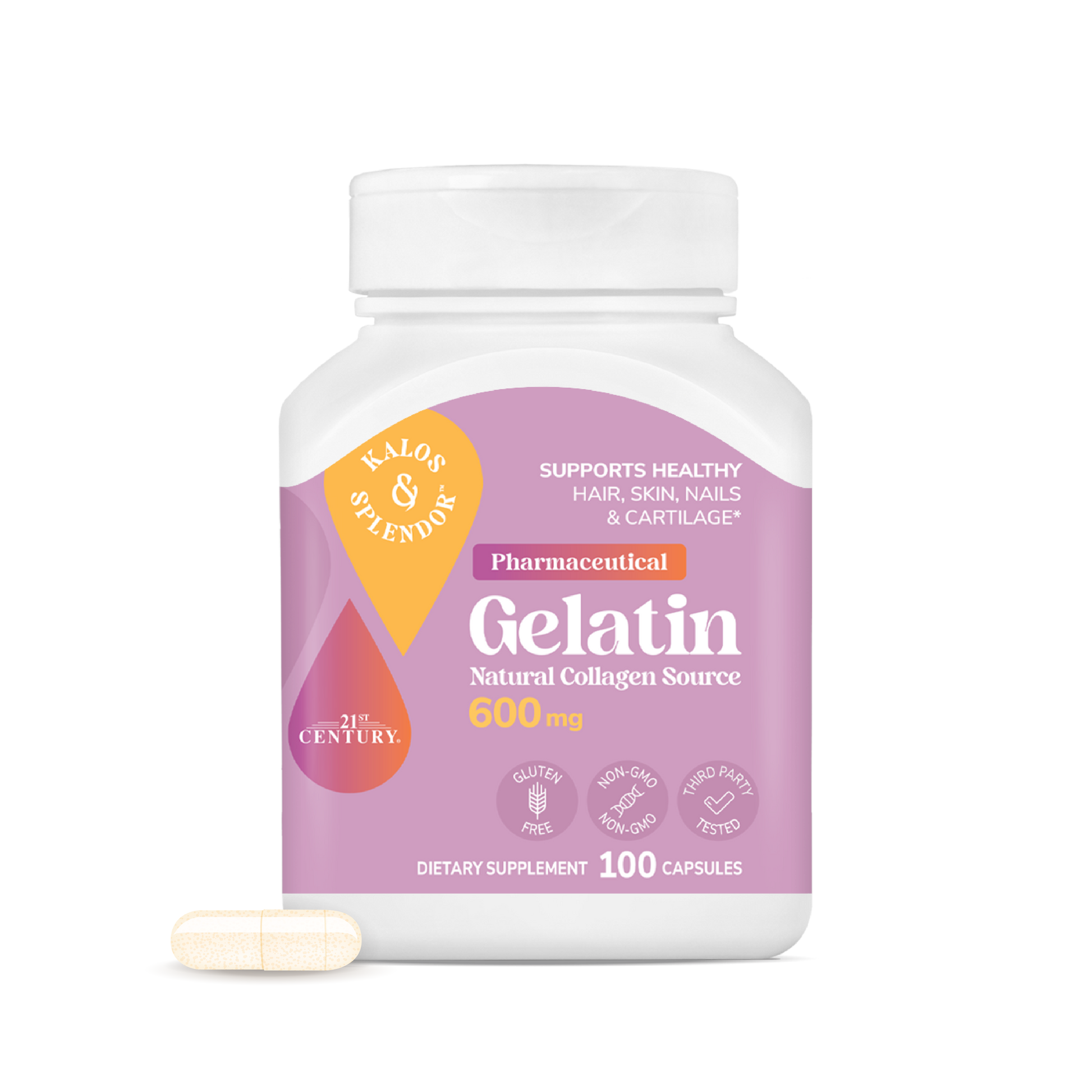 Elevate your beauty routine with 21ST Century Gelatin capsules, formulated to support your hair, skin, nail and cartilage health from the inside out.* Our gelatin capsules offer a convenient and affordable way to support your beauty regimen. Each capsule provides 600 mg of the highest quality pharmaceutical gelatin.
