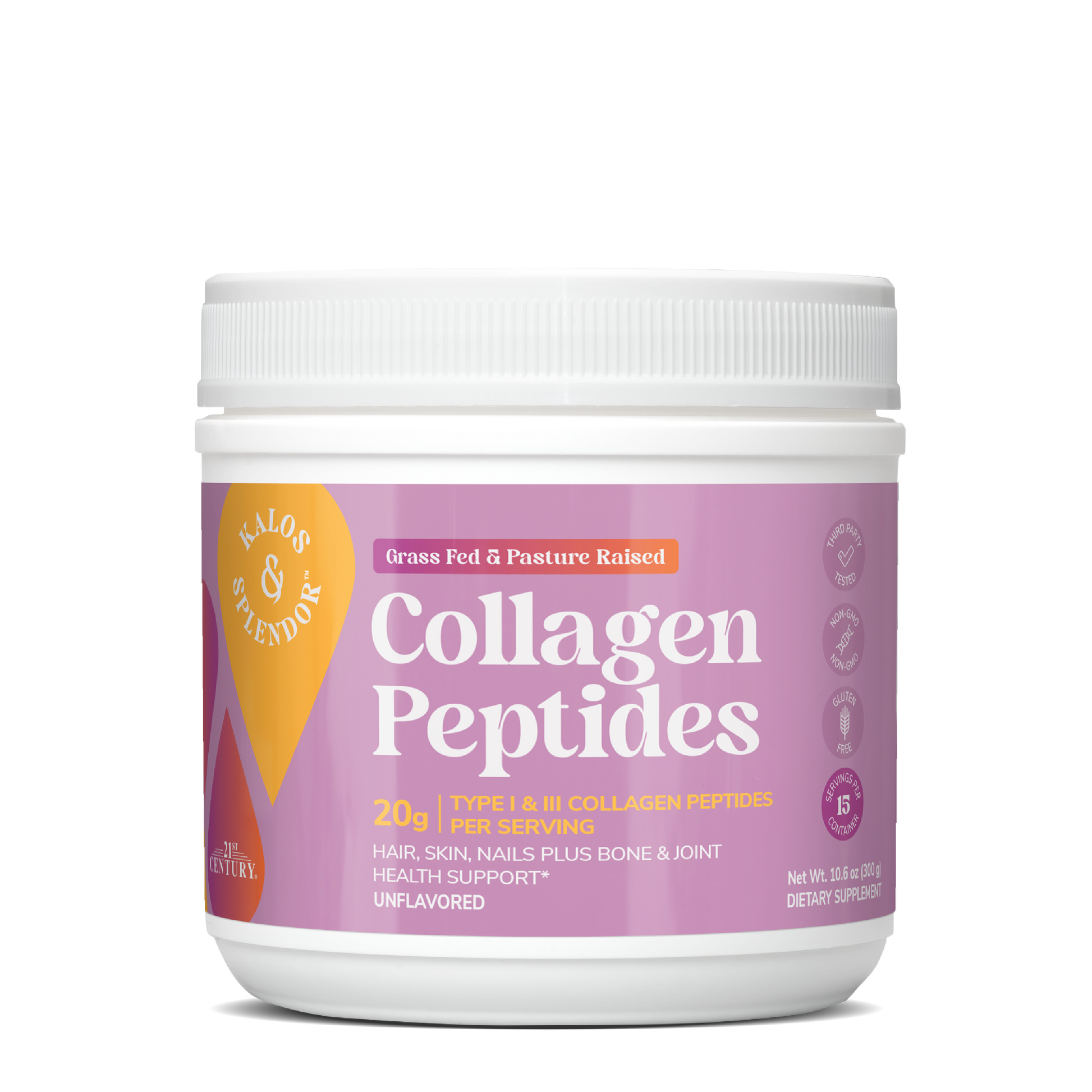 21ST Century Kalos & SplendorTM Collagen Peptides help maintain strength and flexibility throughout the body. Collagen is an important nutrient needed to ensure the health and vitality of skin, hair, nails, cartilage, bones and joints.