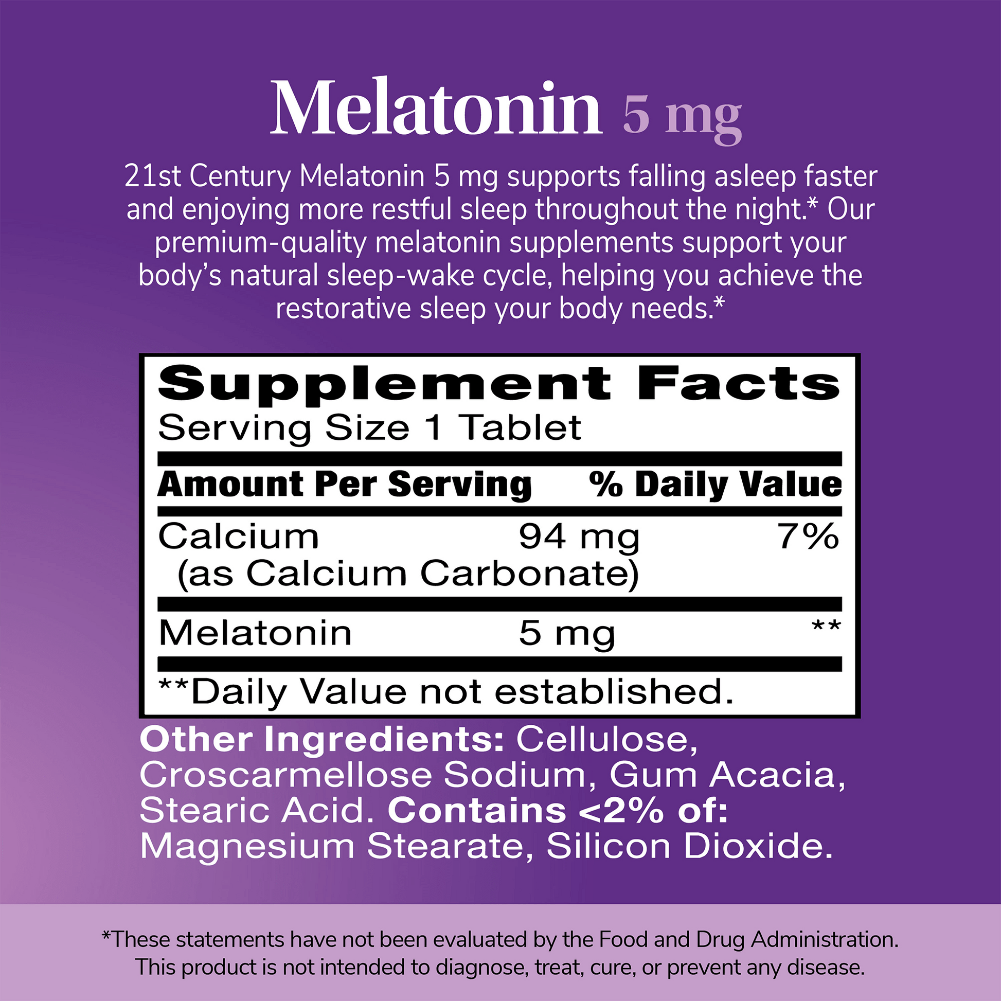 21ST Century Melatonin 5 mg supports falling asleep faster and enjoying more restful sleep throughout the night. Our premium-quality melatonin supplements support your body's natural sleep-wake cycle, helping you achieve the restorative sleep your body need.