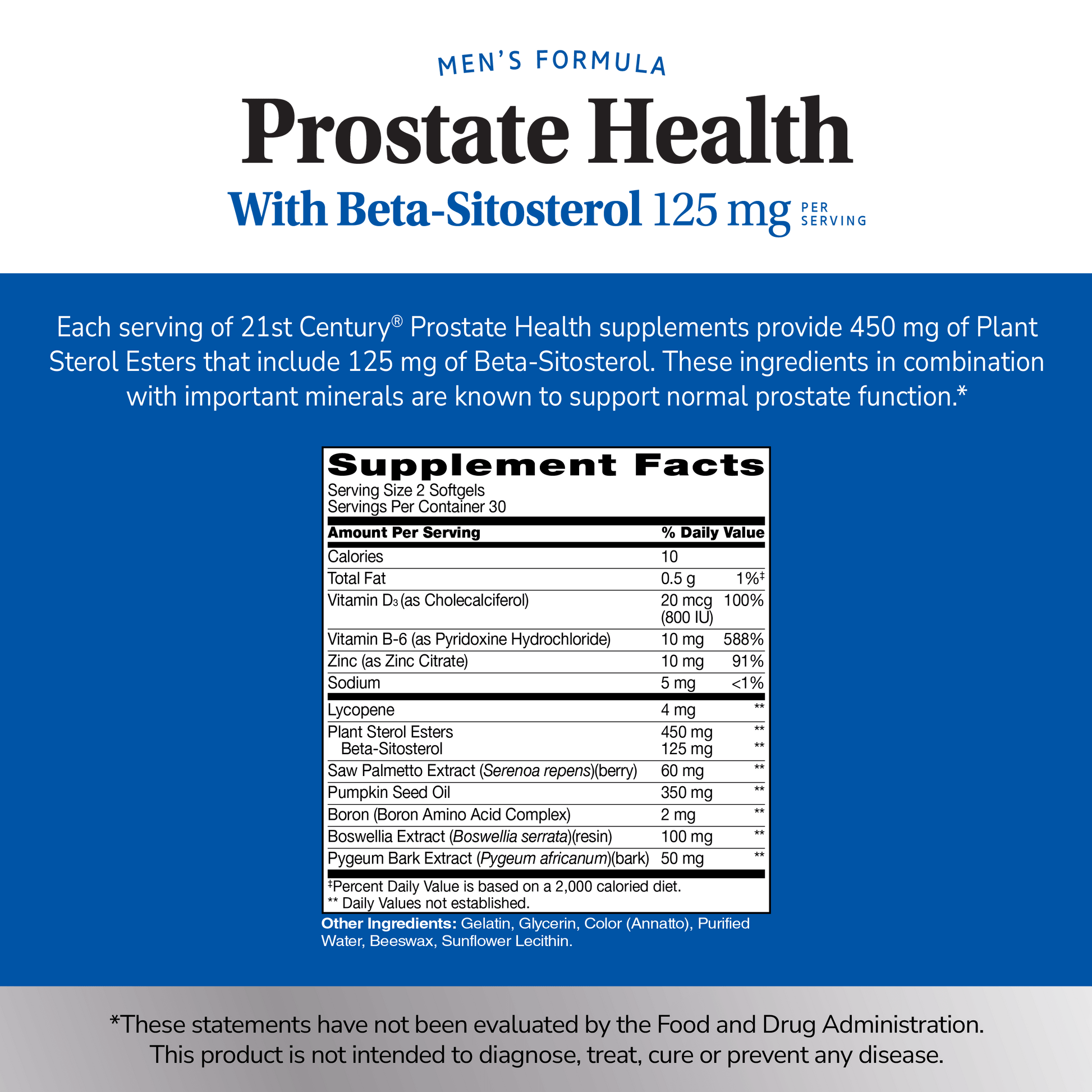Each serving of 21ST Century® Prostate Health supplements provide 450 mg of Plant Sterol Esters that include 125 mg of Beta-Sitosterol. These ingredients in combination with important minerals are known to support normal prostate function.*