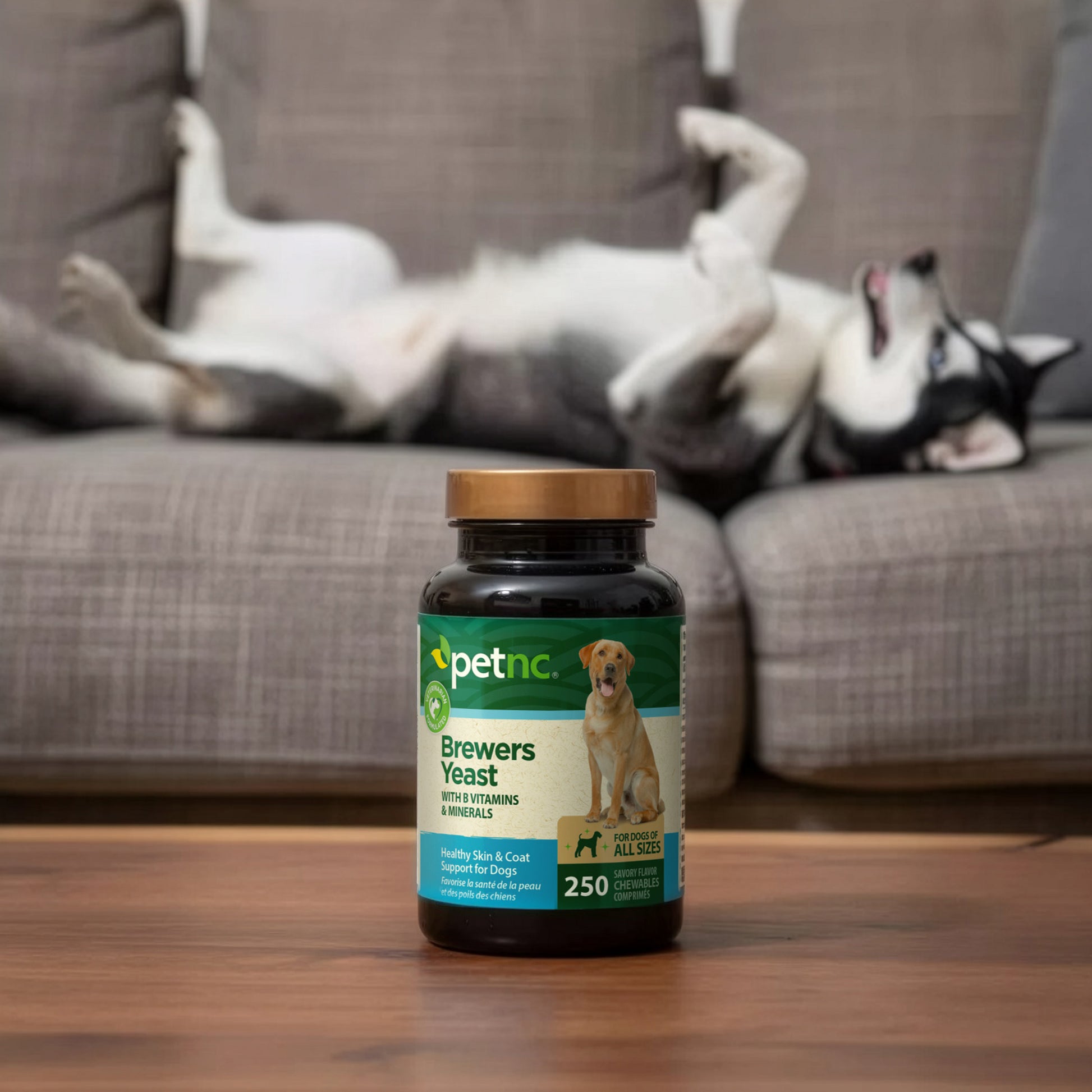 Petnc Brewers Yeast chewables for dogs are formulated with essential B-vitamins, minerals, antioxidants and dietary fiber to support a glossy coat and healthy skin. Brewers Yeast is ideal for adult dogs 10 lbs and over. They are laboratory tested and manufactured in Tempe, Arizona with US and globally sourced ingredients.