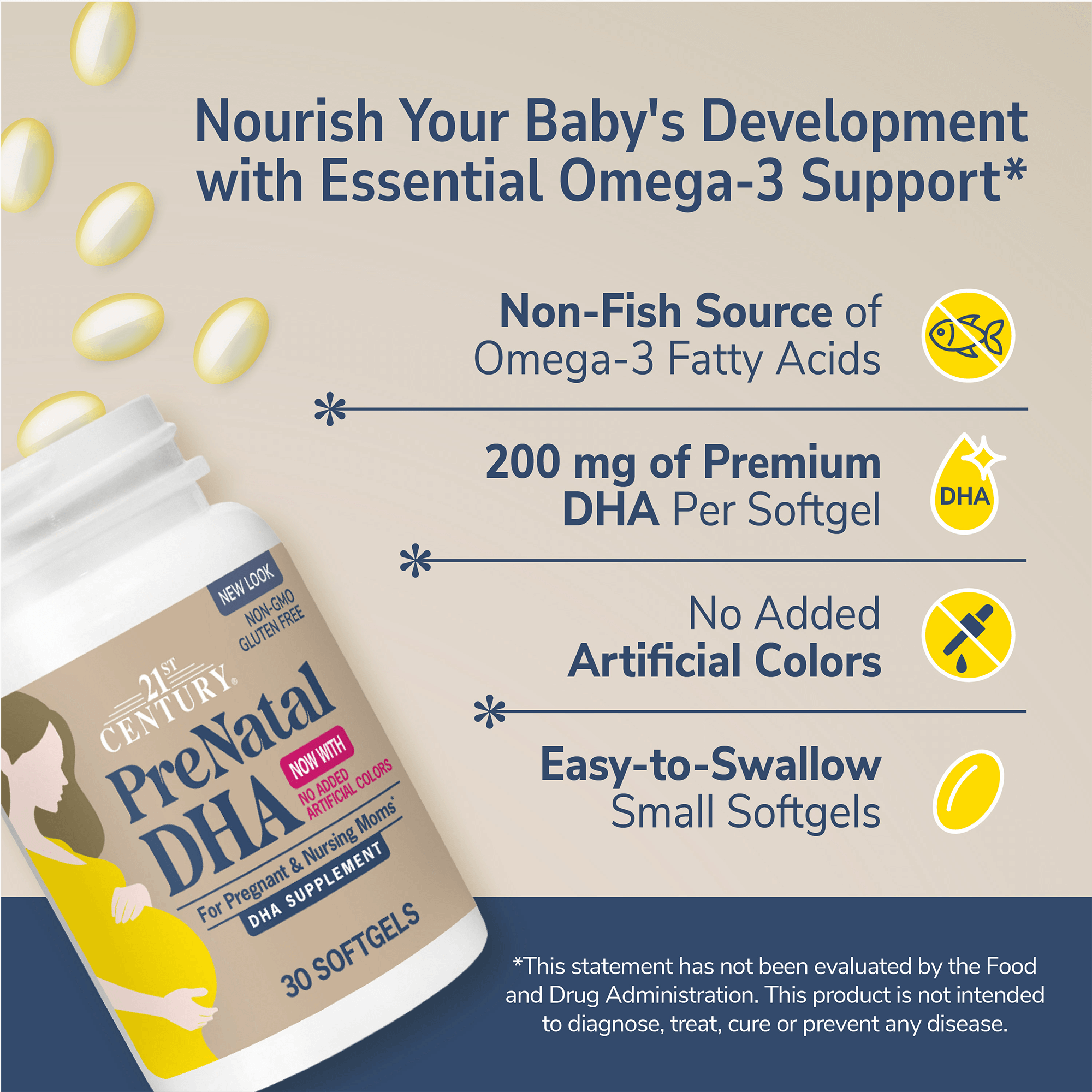 21ST Century® PreNatal DHA softgels are a non-fish source of Omega-3 fatty acids that help support mother and baby during pregnancy and breast feeding.*