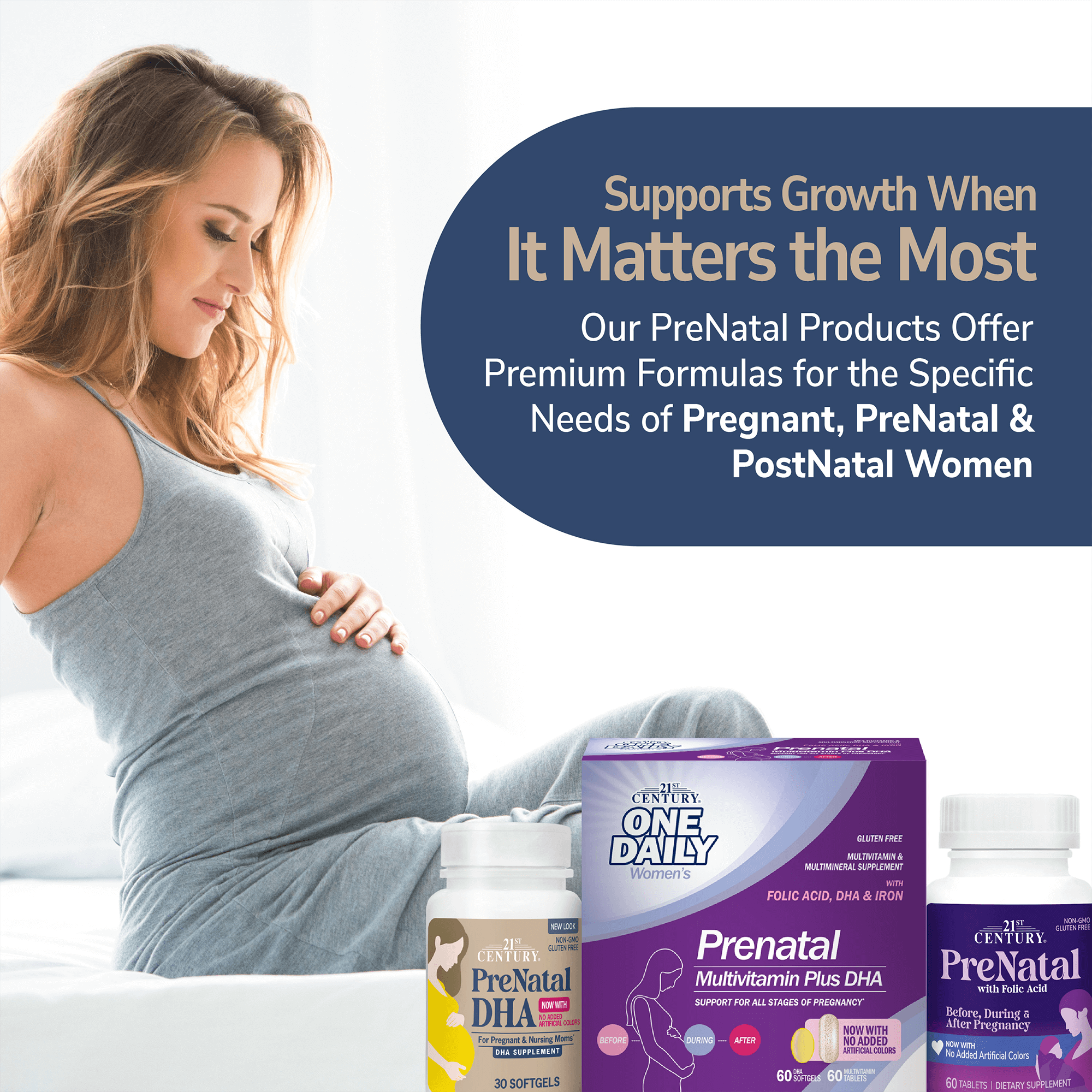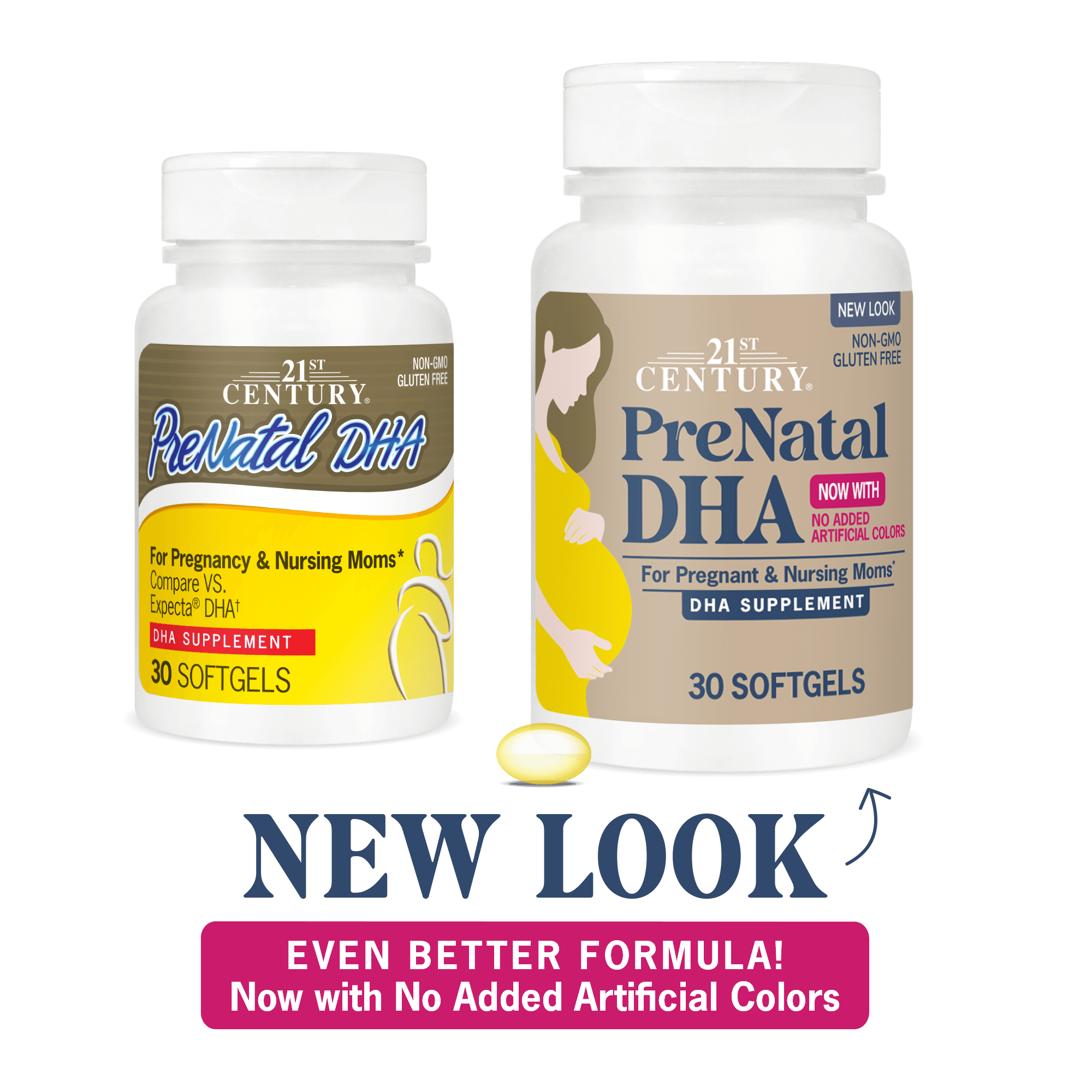 21ST Century® PreNatal DHA softgels are a non-fish source of Omega-3 fatty acids that help support mother and baby during pregnancy and breast feeding.* PreNatal DHA softgels can be taken in combination with the prenatal multivitamin.