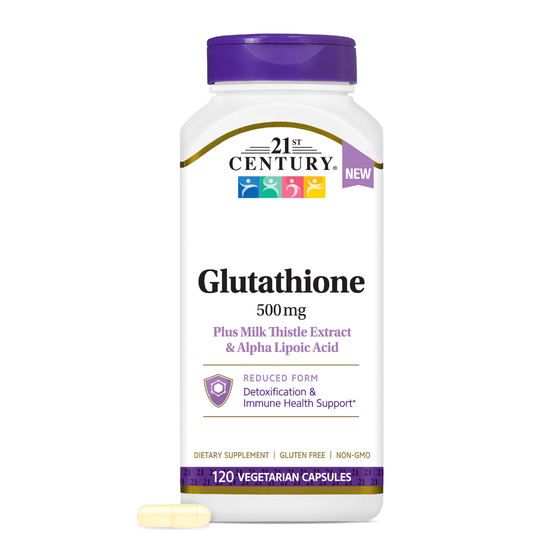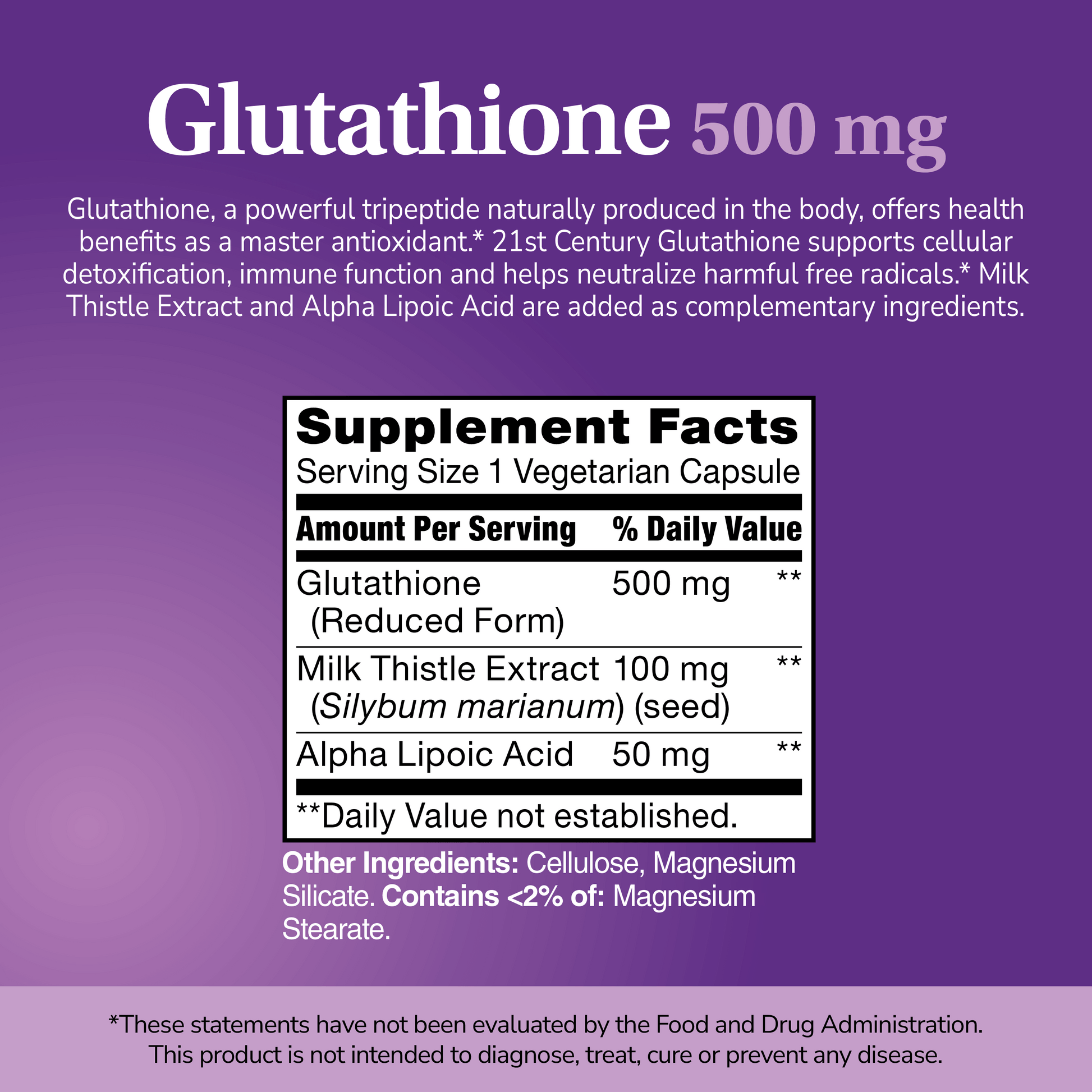 Glutathione, a powerful tripeptide naturally produced in the body, offers health benefits as a master antioxidant.* 21ST Century's Glutathione 500 mg Plus Milk Thistle Extract & Alpha Lipoic Acid supports cellular detoxification, immune function and helps neutralize harmful free radicals.* Milk Thistle Extract and Alpha Lipoic Acid are added as complementary ingredients.
